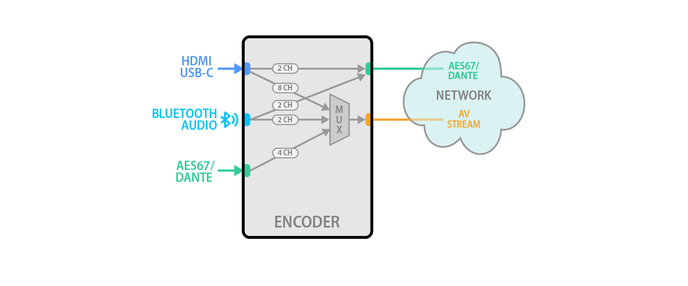 - Provides embedded and de-embedded network audio integration for professional AV environments. Allows easy routing of room microphones, loudspeakers, and DSP-processed signals over standard IP infrastructure.