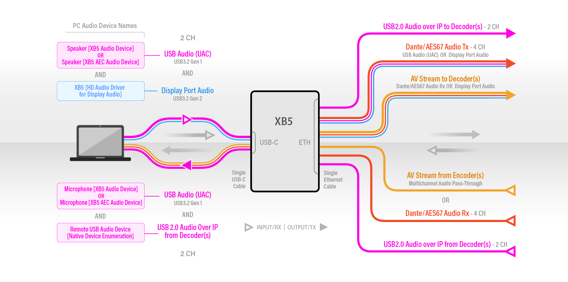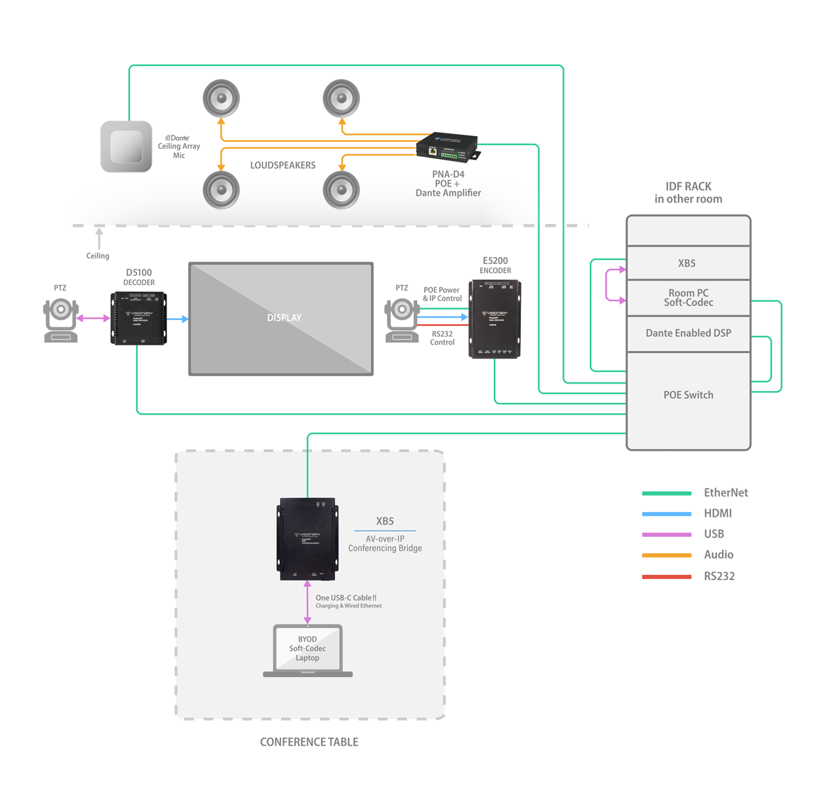 The XB5 supports UVC (USB Video Class) and UAC (USB Audio Class) standards for native compatibility with Windows®, macOS®, and ChromeOS™ — no drivers or software required. It enables immediate interoperability with leading UCC platforms such as Microsoft Teams®, Zoom®, Google Meet®, Webex®, and others, allowing users to join meetings instantly while leveraging the room’s networked AV resources. When connected, the XB5 bridges the user’s device to Dante® and AES67-enabled microphones, loudspeakers, DSPs, and displays, allowing full control and use of high-performance AV hardware during any soft-codec session.