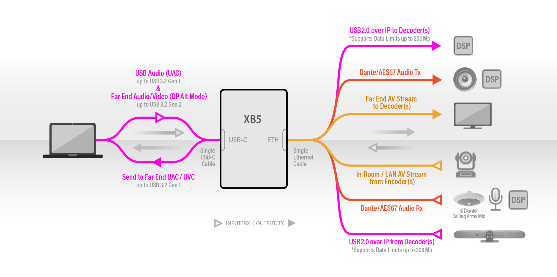 - Enables real-time data transfer for USB devices, such as webcams and microphones, over the network from any decoder to the XB5. This feature simplifies the deployment of video conferencing solutions and offers greater flexibility in AV system design. By leveraging the AV over IP infrastructure, it allows seamless integration and extension of USB peripherals. *** Supports Data Limits up to 200Mb